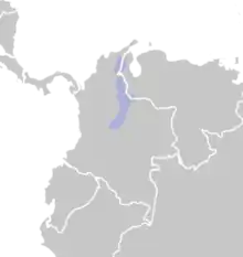 The nominate subspecies of blue-throated starfrontlet is found in Colombia's northern and eastern Andes from the Serranía del Perijá, which straddles the border between northern Colombia and northwestern Venezuela, south and west to the Metropolitan Area of Bogotá. C. h. tamai is found in the Tamá Massif in the western Venezuelan state of Táchira. The species inhabits the interior and edges of cloudforest and elfin forest, shrubby slopes, and sometimes bushy landscapes at the lower margin of páramo. It also occurs in flowering gardens. In elevation it ranges between 1,900 and 3,300 m (6,200 and 10,800 ft).[6]