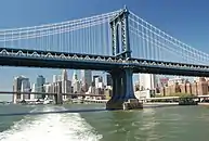 The music video for "Blue" was uploaded to BigBang's official YouTube channel in conjunction with the single's release.[8] Filmed in Brooklyn, New York City, the video was directed by Han Sa-min, who had previously collaborated with the group for the music video for "Love Song" a year prior. In an exclusive interview, video producer Justin Noto commented that the group was "interested in a look that seemed like the drudges of New York, the old 1970s feel." However, Noto added that "the city has been cleaned up a lot since it was like that. So it was a challenge to find places with that iconic, rundown Brooklyn type of feel." The production crew eventually selected the Coney Island Cyclone, a wooden roller coaster at Luna Park, as one of the filming locations for the desaturated visual, where they utilized long dolly shots in order to depict the band members running down a street along the Cyclone. Additionally, several scenes were filmed in an industrial section of Brooklyn and on a rooftop of a warehouse in DUMBO, where it incorporated views of the busy Manhattan Bridge in the background in order to convey a drudge-like urban atmosphere.[44]
