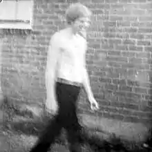 The cover of Blue Corpse completes the series of images that began with Telegraph Melts (1986) and was continued with Modern Dances (1987). While the cover of Modern Dances shows the artist standing still and looking forward, the cover of Blue Corpse shows the artist in mid stride, producing a blurred image of the artist.