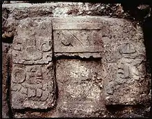 The site divides into two subdivisions that operate in separate functional roles, titled by historians as Plaza A and Plaza B.[1] Archaeologists have found more than 400 residential structures at Blue Creek, indicating the separation evident between the elite and common classes.[12] This social divide was revealed through the excavation of structure 9, now commonly known as “The Temple of the Masks”,[13][1] displaying that the belief in divine kingship was a significant part of the social structure at Blue Creek. The preserved masks were found on the outside of the temple’s façade, and have been dated back to the early classic period, despite being thought initially to have come from the late classic period.[14][1] Pictured to the right is an image of the relief located outside of ‘The Temple of Masks’.[1] This area is believed to be an elite residence where the ‘ajaw’ mask signifies that it was a house for Maya rulers.[11] The term ‘ajaw’ refers to the image of the half abstracted face, which is symbolic of the lord.[11] The bibs underneath each mask indicate its origins from the early classic period.[1] This structure suggests that Blue Creek was an independent community with its own hierarchy and ruling system.[1] Further evidence of religious practices is apparent through a structure located at the back of Plaza B, titled the ‘Temple of the Obsidian Warrior’.[1] This temple was looted like many other structures at Blue Creek,[1] which have provided significant obstacles in the research of archaeologists.