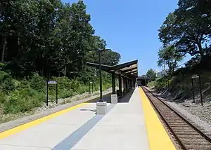 Final design of the station, including analyzing 26 nearby homes for noise abatement, was expected to be completed in the middle of 2012. However, local elected officials demanded an independent design review of the project, further delaying the project to at least 2015.[7] The MBTA had planned to advertise the $10 million construction contract in December 2012, but did not do so.[10] In July 2013, the MBTA announced that construction would begin within several months, but again this was a false start.[11] A public meeting held in April 2014 showed mixed local opinions about the stations, with some nearby residents feeling that the stop was imposed on the neighborhood by the MBTA without sufficient public input.[12] At that meeting, the MBTA presented a plan under which construction would begin in May 2015 for a December 2016 opening.[13] A later meeting in September 2014 adjusted the schedule, with construction beginning in September 2015 for a June 2017 opening.[2]