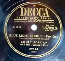 "Blue Light Boogie" is a song written by Jessie Mae Robinson and Louis Jordan. It was performed by Louis Jordan and his Tympany Five, recorded in June 1950, and released on the Decca label (catalog no. 27114). On the original 78 record, the song was divided into two parts with part 1 on the "A" side and part 2 on the "B" side.[1][2]