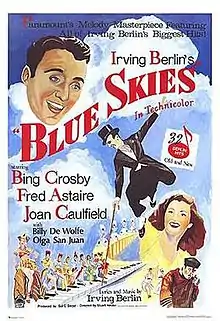 Blue Skies is a 1946 American musical comedy film directed by Stuart Heisler and starring Bing Crosby, Fred Astaire, and Joan Caulfield. Based on a story by Irving Berlin, the film is about a dancer who loves a showgirl who loves a compulsive nightclub-opener who can't stay committed to anything in life for very long. Produced by Sol C. Siegel, Blue Skies was filmed in Technicolor and released by Paramount Pictures. The music, lyrics, and story were written by Irving Berlin, with most of the songs recycled from earlier works.