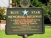 Blue Star Memorial Highways are highways in the United States that are marked to pay tribute to the U.S. armed forces. The National Council of State Garden Clubs, now known as National Garden Clubs, Inc., started the program in 1945 after World War II. The blue star was used on service flags to denote a service member fighting in the war. The program has since been expanded to include Memorial Markers[1] and Memorial By-ways (since 1994).[2] These markers are used in National Cemeteries, parks, veterans facilities, and gardens.