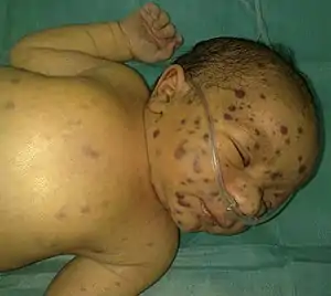 Blueberry muffin baby, also known as extramedullary hematopoiesis, describes a newborn baby with multiple purpura, associated with several non-cancerous and cancerous conditions in which extra blood is produced in the skin.[1] The bumps range from 1 to 7 mm, do not blanche and have a tendency to occur on the head, neck and trunk.[1] They often fade by three to six weeks after birth, leaving brownish marks.[3] When due to a cancer, the bumps tend to be fewer, firmer and larger.[2]