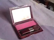 Rouge (/ˈruːʒ/; meaning "red" in French), also called blush or blusher, is a cosmetic for coloring the cheeks in a variety of shades, or the lips red. It is applied as a powder, cream or liquid.
