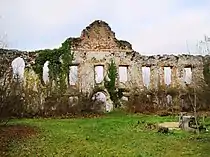 Boštanj Castle (Slovene: grad Boštanj, German: Weißenstein) stands on the foundations of a Roman fortification.[3] It was built up in the mid-16th century by Jacob von Lamberg. In 1678 ownership was assumed by the Ursini-Blagay family, who remained the owners until the beginning of the 20th century. It was a Renaissance castle designed like a fortress with a central rectangular building fortified with towers and a defensive wall.[6] The castle contained many late Gothic and Renaissance architectural elements, and also featured valuable Rococo and Classicist murals and ceiling paintings.[3] During the Second World War, after forcing besieged White Guard forces at the castle to withdraw to Turjak Castle,[7] the Partisans plundered and burned Boštanj Castle on 12 September 1943.[3][8] The castle burned for 14 days and the local fire department was forbidden from extinguishing the fire.[9]