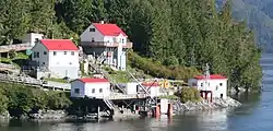 Boat Bluff Lighthouse is located near Klemtu on the scenic south end of Sarah Island in Tolmie Channel on the Inside Passage of British Columbia.[2] The lighthouse was established in 1907.[3] The skeleton tower is 24 feet high giving it a focal plane 38 feet above sea level. The station is still staffed by resident keepers.