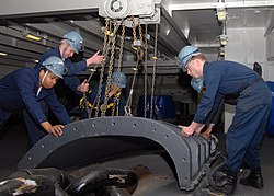 In the U.S. Navy, the ship's Boatswain is a Warrant Officer who serves as a subject matter expert and assists the first lieutenant by supervising the deck force in the execution of major seamanship functions and the maintenance of topside gear.[6] The ship's Boatswain supervises cargo handling[6] and inspects and maintains rigging and deck gear.[6] His duties also include supervising anchoring, mooring, fueling, towing, transferring of personnel and cargo, and the operation and maintenance of ship's boats.[6] The ship's Boatswain is in charge of what the Navy deems "unusual" seamanship operations such as retrieving target drones,[6] and also schedules training for Deck department or Deck division personnel.[6] Another key duty of the ships' Boatswain is supervision of the maintenance of abandon-ship equipment and instruction in abandon-ship techniques.[6]