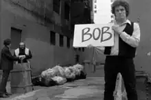 The music video references the recording of Dylan's song, "Subterranean Homesick Blues" in the 1967 D. A. Pennebaker documentary Dont Look Back.[2] The video for "Bob" is similarly shot in black and white, and in the same back-alley setting, with Yankovic dressing as Dylan and dropping cue cards that have the song's lyrics on them, as Dylan did in the film.[2][3][10] The video features cameo appearances by drummer Jon "Bermuda" Schwartz and frequent Yankovic video director Jay Levey, standing in the same positions as Allen Ginsberg and Bob Neuwirth in the Dylan video.