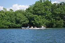 Boca del Cielo's main distinction is a long lagoon called La Joya, which is separated from open ocean by a sliver of land or shoal broken in the middle.[1][2] The name, which means “mouth of heaven,” refers to this opening which looks off into open ocean where the sun sets in the evening.[5] The water of the lagoon is generally shallow and is a mixture of fresh water from the estuary of a small river and sea water from the ocean.[1][5] The opening in the shoal allows for this mixture and also causing the level of the lagoon to rise and fall depending on the tide. The water is shallow enough, especially at low tide, for people to cross it without a boat, with the water coming up only to the knees or waist. In areas, sand bars with pool of water and islands appear. The exception to the shallowness is near the opening to the sea where water is deeper with strong currents. Here, the water can be as deep as ten meters with the opening as wide as fifty meters, depending on the tide.[1][4] The lagoon extends for kilometers on either side of Boca del Cielo, with many of the banks away from the tourist areas covered with mangroves.[6] The lagoon is rich in fish and shrimp.[7]