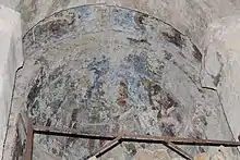 The church of Saint George is a hexaconch—a six-apse domed building—originally constructed in the 10th or 11th century and since then remodeled several times. Built of sandstone, both inner and outer walls were once faced with dressed stone slabs. The entrances are located in the southwestern and northwestern apses. The southwestern porch is topped by a belfry, which is a 17th-century annex. The altar apse is demarcated by an 18th-century brick iconostasis. The outer layout is dodecagonal, each facet covered by a pitched roof. The base of the dome, now in ruins, is pierced with six windows. The interior bears frescoes, which are, judging from the style of paintings, dated to the early 12th century and in a very poor state of preservation. These includes scenes from the lives of Jesus and Saint George and portraits of various saints.[1] In the lowest register of the northeastern conch of the church is a donor who is identified with King David IV of Georgia (r. 1089-1125). He stands next to an image of the Byzantine emperor Constantine the Great and his mother Helena. The iconography illustrates David's promotion of his status as a Christian monarch and a claim to symbolic succession to the Byzantine emperor in the region, which he had only acquired in 1104.[3]