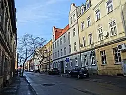 The tenement at Nr.49 (then "15 Brenkenhoff Straße") had Jacob Schott as landlord. Owner of the nearby building at 40, he was running a colonial goods shop (German: Kolonialwaren).[30] Nr.51 (then "15a Brenkenhoff Straße"), at the intersection with Sowińskiego street, was first owned by Albin Cohnfeld, a rentier, living at "32 Banhoff straße" (today 77 Dworcowa Street).[16] The following landlord was Konrad Zielsdorf, who had there a restaurant which he operated till the mid-1930s.[31] From 1920 to the start of WWII, two hairdress businesses stood at street level, run by Jan Fritzkowski (Nr.49) and Stanisław Nowakowski (Nr.51).