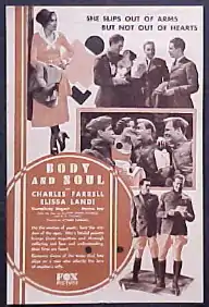 Body and Soul (1931) is an American Pre-Code action drama film directed by Alfred Santell and starring Charles Farrell, Elissa Landi, Humphrey Bogart, and Myrna Loy.[1] The story, adapted from the stage play Squadrons by Elliott White Springs and A.E. Thomas, depicts Royal Air Force pilots in World War I.[Note 1]