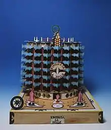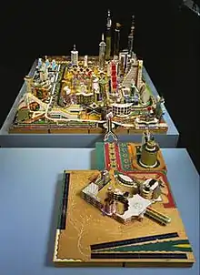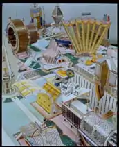 Kingelez is known primarily for his models of fantastic and utopian cities made of scrap materials like cardboard, paper and plastic; these models depict an idealistic vision of society that contrasts our harsh reality and dually a statement against the widespread construction funded by The World Bank in collaboration with corrupt African regimes.[6] He sought to establish a fairy-tale world in his work that reflected his inner fantasies and ideals he had envisioned for reality that would be open for all to explore;[7] as Sarah Suzuki, curator at the Museum of Modern Art New York, has said: Kingelez's work creates "a place of optimism, a place of beauty... That feels very welcome."[1]