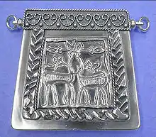 Three silver kaptorgi were found at the site.[92] These are small boxes that are associated with magic and ancient ritual.[93] They often contained amulets, precious items, or plant materials that were used to protect against evil.[94] Two of these were decorated with a unique eagle design, the third was very poorly preserved.[95] The eagle depicted on two of the kaptorgi did not have talons, which is a motif that has appeared in Merovingian and Anglo-Saxon cultures.[96] Eagles were a common powerful motif in Roman, Greek, Scandinavian, Rus and Germanic cultures, though these depictions usually contained talons.[97]