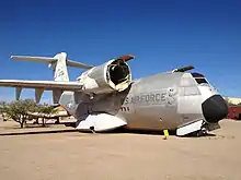 The first Boeing YC-14 (serial number 72-1873) flew on 9 August 1976.[2] Two aircraft were built, the second being s/n 72-1874. The competing YC-15 had started flights almost a year earlier. Head-to-head flight testing at Edwards Air Force Base started in early November 1976. During flight testing, the YC-14 was flown at speeds as low as 59 kn (68 mph; 109 km/h) and as high as Mach 0.78 at 38,000 feet (11,600 m).[3] However, it was found that the YC-14's drag was 11% higher than originally predicted. Modifications developed in wind tunnel testing, comprising the addition of vortex generators to the upper aft portion of the nacelles, deletion of the nozzle door actuator fairing, alterations to the aft end of the landing gear pods and the addition of aft fuselage strakes, reduced this drag increment to 7%.[4] The YC-14 also demonstrated the capability to carry the 109,200-pound (49,500 kg) M60 Patton main battle tank, which was not demonstrated with the YC-15.[3]