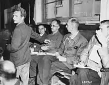 On 11 April, advance parties of the US 3rd Armored Division entered Nordhausen with little opposition.[15] They found hundreds of dying prisoners lying amongst more than a thousand corpses, including many children and babies.[16][lower-alpha 3] Some had been dead before the air raid;[5] others were burned to death or died after the air raid from neglect.[16] The American soldiers were outraged; one wrote, "No written word can properly convey the atmosphere of such a charnel house, the unbearable stench of decomposing bodies, the sight of live human beings... lying cheek by jowl with the ten-day dead..."[15] A 15 April report describes the camp as "the most horrifying example of Nazi terrorism imaginable".[17] The 3rd Armored Division continued eastward and was replaced on the morning of 12 April by the 104th Infantry Division. According to some accounts, soldiers of the 104th Infantry Division killed German civilians in Nordhausen who denied knowledge of the atrocities, believing that they were partially responsible.[17]