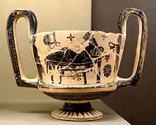 From the 6th to the 4th century BC, Boeotia produced black-figure vases. In the early 6th century, many Boeotian painters still used the orientalising silhouette technique. Thereafter, the followed Attic production particularly closely. At times, distinction between or ascription to the two areas is difficult, some material can also be confused with Corinthian vases. Often, Attic vases of low quality are mistaken as Boeotian. There was probably some level of exchange of personnel with Attica; in at least one case, Bird-Horse Painter, an Attic artist emigrated to Boeotia, the same also probably applies to the Tokra Painter and certainly to the potter Teisias the Athenian. Important motifs included animal friezes, symposia and komasts. Mythological imagery is quite rare; when it occurs, it usually shows Herakles or Theseus. In the late 6th and early 5th centuries, a silhouette style prevailed. Painted shapes were predominantly kantharoi, lekanai, kylikes, plates and jugs. Between 420 and 350 BC, the Kabiria Group were the dominant black-figure style in Boeotia. As in Athens, kalos inscriptions occurred. Boeotian potters had a predilection to produce plastic vessels, also kantharoi with plastic applications and tripod-pyxides. Lekanis, kylix and neck amphora were adopted from Athens. The paintings style often appears comical; komasts and satyrs were preferred motifs.