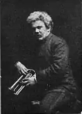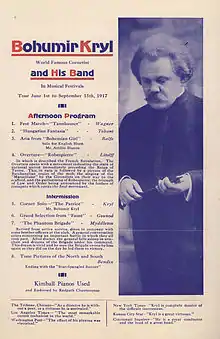 Bohumir Kryl (originally Bohumil Krill, also Bohumír Kryl) was born on May 3, 1875, at Hořice 230, Bohemia, Austria-Hungary.[2][3] He was baptized Catholic 7 days later.[4] His first instrument was the violin, which he studied at age 10.[3] While attending school in Hořice he was classmates with Jan Kubelík, with whom he maintained correspondence.[5] He spent time performing both the violin and the cornet for a circus band in Prague.[3][6] He also performed as an aerialist acrobat with the Rentz Circus in Germany,[7] but an accident in 1886 ended this line of work.[2] His father was a sculptor, and Bohumir also studied this art.[2] He emigrated to the United States in 1889,[3][8] paying the fare in part by performing with the ship's orchestra.[9] Moving to Chicago, English sculptor H.R. Saunders furthered his profession in that area. Bohumir followed Saunders to Indianapolis[1] and was soon employed, along with his brother,[10] as a sculptor by General Lew Wallace and also working on the Soldiers' and Sailors' Monument.[2] Simultaneously he joined the When Clothing Company Band, playing the cornet[9] and soloing on this instrument.[2] Before long he was hired by John Philip Sousa, but was fired in 1898 by Sousa because he copied some of the band's music for his own personal use.[11] He then joined Thomas Preston Brooke's Chicago Marine Band, where he spent the next two years.[2] During this time he studied with Weldon of Chicago's Second Regiment Band.[2] In 1901 he spent some time with Phinney's United States Band,[12] but he joined the Duss Band permanently that year.[2] This group was based at Madison Square Garden, at $800 per-month and became its assistant conductor in 1903.[9] This band, led by Frederick Innes, was not as well known, but he was hired as soloist, and the heavy touring schedule and two solos per concert gained him wide exposure.[2] His solos would result in requests for multiple encores.[13] Studying bandleaders Creatore and Vessela, he adopted a wild 'lionesque' hairstyle that became his trademark.[2][14] He became acquainted with Joseph Jiran, who owned a Czechoslovak music store in Chicago. With Jiran's encouragement, he formed his own band in 1906[2] styled as Kryl's Bohemian Band by 1910[3] with the Cimera brothers.[15] This group worked for Columbia, Victor, and Zonophone, recording works by such composers as Smetana, Dvorak, and Safranek.[3] He earned the distinction of the first Czech musician to record on phonograph cylinders.[1] Kryl's older brother František Xaverský (Frank) Kryl became a band-leader in Chicago.[16] An even older brother Jan Křtitel (John) was president of the Pilsen Foundry & Iron Works there.[17]