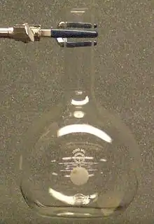 ![]() Photograph of a 1 liter Florence flask suspended by its neck with a three-finger clamp | |