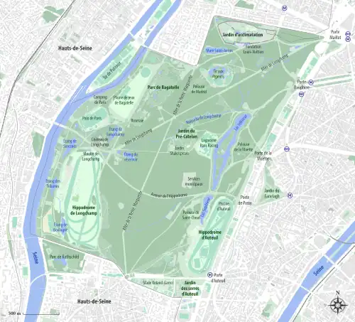 The Bois de Boulogne (French pronunciation: [bwɑ d(ə) bulɔɲ], "Boulogne woodland") is a large public park located along the western edge of the 16th arrondissement of Paris, near the suburb of Boulogne-Billancourt and Neuilly-sur-Seine. The land was ceded to the city of Paris by the Emperor Napoleon III to be turned into a public park in 1852.[1]