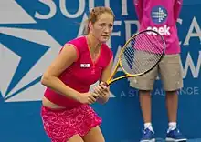 Jovanovski played her first event of the season at the Shenzhen Open, where she was seeded eighth. She defeated Alexandra Cadanțu in the first round and Duan Yingying in the second, but lost in the quarterfinals to Li Na, who went on to win the tournament.[90] Jovanovski then played in Hobart, where she defeated María Teresa Torró Flor, before losing to Kirsten Flipkens in the second round.[91] At the Australian Open, Jovanovski again defeated Torró Flor, the 17th seed Lucie Šafářová, and Kimiko Date-Krumm, before losing to eventual semifinalist Sloane Stephens in the fourth round. This had been her best career Grand Slam result of her career.[92] In doubles, Jovanovski partnered with Melinda Czink to triumph over Simona Halep and Arantxa Rus in the first round, but then fell to Natalie Grandin and Vladimíra Uhlířová in the second.[93]