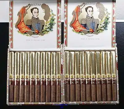 The Cuban Bolívar has a reputation among cigar aficionados of being one of the strongest and most full-bodied cigars, with its Royal Corona, Coronas Junior, Petit Coronas, and Belicosos Finos being famous examples of the marque.[1][3] In 2002, when Altadis bought a controlling share in the Cuban government-owned cigar distributor, Habanos SA, a number of changes in cigar production were instituted. One of these changes was the decision to gradually turn the various brands of Cuban cigars to either all-handmade or all-machine-made lines. Bolívar, which has historically produced a variety of handmade and machine-made or machine-finished cigars, had several of its vitolas cut from production, with only one remaining, the cigarillo-sized Chicos. It remains to be seen if this size will eventually cease to be produced as well.