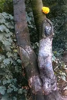 Marc Bolan died, aged 29, from injuries sustained when his purple Mini, driven by his girlfriend Gloria Jones, crashed. Jones lost control of the car and it struck a steel reinforced chain link fence post,[1] and came to rest against a sycamore tree[2] after failing to negotiate a small humpback bridge, near Gipsy Lane on Queens Ride, Barnes, south-west London. From the day of the accident the site became a place of pilgrimage to Bolan fans and this was reported in various newspapers from 1978 onwards. Coincidentally the registration number of the car was FOX 661L and within the lyrics of his single "Solid Gold Easy Action" are the lines "Easy as picking foxes from a tree" and "Woman from the east with her headlights shining"[3][4][5][6]
