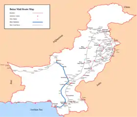 Bolan Mail (Urdu: بولان میل) is a passenger train operated daily by Pakistan Railways between Karachi and Quetta.[1] The trip takes approximately 20 hours 25 minutes to cover a published distance of 916 kilometres (569 mi), running at 45 kilometres per hour (28 mph) & traveling along a stretch of the Karachi–Peshawar Railway Line, Kotri–Attock Railway Line and Rohri–Chaman Railway Line. The train is named after the famous Bolan Pass, a strategically located pass connecting to Central Asia.