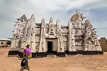 It is made of mud in a Sudanic architectural style of Sudano-Sahelian architecture with sticks and mud.[1][8][9] It also has wooden poles found between the buttresses but do not function as structural support to the building. They are used as scaffolding for maintaining the painting and plaster at times. It has short towers.[10]