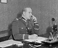 In 1914, he moved to Kraków and joined the First Cadre Company, which fought on the Austro-Hungarian side against Russia. In October 1914 he became a commander of a platoon of a squadron in 1 Pułk Ułanów Legionów Polskich. During the fighting in 1914–1915, he was promoted to lieutenant, and after the war he was awarded the V-Class Virtuti Militari. In August 1915, he moved to the special group in Warsaw. Soon he became an aide-de-camp to Józef Piłsudski. In 1918, he was sent on a mission to Russia. He was given three tasks: persuade General Józef Haller's army,[9] then in the Ukraine, to back Piłsudski (he failed in this task); reach the French military mission in Moscow under General Lavergne[10] (he succeeded in this task); and return from Moscow to Paris to liaise with the government there. Unfortunately, he was arrested by the Soviet Cheka as a member of the Polish Military Organisation while on a French diplomatic train on its way from Moscow to Murmansk (and Paris). He was imprisoned in the Taganka prison. He was freed thanks to the intervention of his future wife, Bronisława Wieniawa-Długoszowska, with the much-feared Cheka operative Yakovleva, then in charge of the prison. Bronisława, née Kliatchkin, was at that time married to the lawyer Leon Berenson, the lawyer of Felix Dzerzhinsky, the head of the Cheka. She was a Lutheran, her family having converted from the Jewish faith when she was eight. He married her in a Lutheran ceremony[11] on 2 October 1919 at Lutheran zbór in Nowy Gawłów. The marriage register records the details from her false French passport, including "Lalande" as her maiden name.