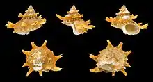 The shell has an equilateral-triangle profile, being approximately as tall as it is wide. The whorls are slightly inflated and are sculpted with strongly beaded spiral threads and a row of splayed hollow spines along the shoulder. A smaller second row of spines is situated below the shoulder on the last whorl. The base color of the shell is lavender to reddish purple with golden maculations outlined in a darker purple. The base has strong spiral threads which are weakly beaded and is paler in color than the body, with scattered darker and lighter beads along the threads. The siphonal canal is closed and is ivory white near the aperture with a golden yellow to orange edge adjacent to the base. The aperture is white and nacreous. The size of the adult shell varies between 30 mm and 80 mm.