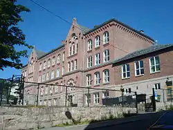 Today's campus grounds were once occupied by a large toad pond, which is said to have been enjoyed by the local youth.[2] At the time, it was located in the countryside. Upon its inception, there were a total of 1299 students receiving education in two shifts, one in the morning (8:00-12:00), and one in the afternoon (12:00-16:00). The campus is split into two schoolyards, originally done to keep boys and girls separated,[1] it is now used to split higher and lower grades (1-4, 5–7). For a long time, the school was one of the largest of its kind in the country.[2]