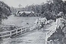 One of the first houses in Bomaderry was Lynburn which still exists today. It was built in 1895 by the architect Howard Joseland[4] for Jane Morton, the widow of Henry Gordon Morton, the manager of the Shoalhaven Estate. A photo shortly after its construction is shown. The road over the bridge in the photo is now the Princes Highway where it crosses Bomaderry Creek.