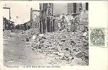 The Bombardment of Casablanca (Arabic: قصف الدار البيضاء; French: Le bombardement de Casablanca) was a French naval attack taking place from August 5 to 7 in 1907 that destroyed the Moroccan city of Casablanca.[1] France used mainly artillery fire from battleships to bomb the city and targets in the surrounding area, which caused an estimated 1,500 to 7,000 Moroccan deaths.[1] The bombardment of Casablanca opened a western front to the French conquest of Morocco after Hubert Lyautey's occupation of Oujda in the east earlier that year.