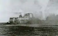 After failing to stop his vessels, Sampson ordered Iowa to train her guns on the nearest enemy stronghold, the Morro castle. This was only a ruse though; Iowa fired one shot into the water and the Spanish, believing they had been fired on, returned a salvo from their battery which failed to score a direct hit. Iowa fired again with a massive broadside which reportedly blew away a large portion of the castle.