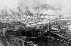 The Spanish bombarded the town unhindered.[5] The loss in public and private property was estimated at $1,000,000, and in merchandise at $9,000,000, huge sums at the time.[6] One recent account suggests that in today's money the losses amounted to the equivalent of around $224,000,000 [7]