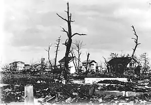 The main raid on Nagaoka occurred on 1 August 1945. Commencing at around 10:30 p.m. that night, 125 B-29 Superfortress bombers from the 313th Bombardment Wing struck the city with an estimated 163,000 incendiary bombs totaling 925 tons. The raid lasted for 1 hour and 40 minutes.[6][1] The city suffered severe damage, though estimates of its extent vary: in 1953 the USAAF's official history stated that 65.5 percent of Nagaoka's urban area was destroyed, and this figure was also used by historian Richard B. Frank in 2001. However, in 2016 The Washington Post reported that 80 percent of Nagaoka had been burnt out.[6][7][1] A total of 1,486 people were killed in Nagaoka, including more than 280 school age children.[6] The American force that attacked Nagaoka did not suffer any casualties.[1]