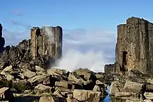 Two units of the Late Permian Gerringong volcanic facies are exposed on Bombo Headland. The Kiama Sandstone member forms a narrow wave-cut platform and adjacent vertical cliff face around the south-eastern extremity of the quarry. To the north, the sandstone dips below sea level and is overlain by about 20m of porphyritic basalt, termed Bombo Latite member. The contact between the two units is well-exposed in the cliff section at the eastern end of the two points comprising the headland section. The red-brown colour (due to oxidization of haematite) of the sandstone contrasts markedly with the grey-black latite, which displays spectacular columnar jointing elsewhere in the quarry. Isolated columns 5–5 meters in height stand adjacent to the coast between the north and south parts of the quarry; just to the north the sea wall exposes cross-sections of the columns 1-2.5 metres in diameter, resulting in a "Giants Causeway" appearance.[1]