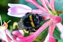 The bumblebee tongue (the proboscis) is a long, hairy structure that extends from a sheath-like modified maxilla. The primary action of the tongue is lapping, that is, repeated dipping of the tongue into liquid.[29] The tip of the tongue probably acts as a suction cup and during lapping, nectar may be drawn up the proboscis by capillary action. When at rest or flying, the proboscis is kept folded under the head. The longer the tongue, the deeper the bumblebee can probe into a flower and bees probably learn from experience which flower source is best-suited to their tongue length.[30] Bees with shorter proboscides, like Bombus bifarius, have a more difficult time foraging nectar relative to other bumblebees with longer proboscides; to overcome this disadvantage, B. bifarius workers were observed to lick the back of spurs on the nectar duct, which resulted in a small reward.[31]