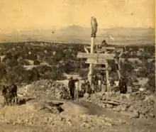 Ownership of the Cerrillos Hills region passed to Mexico in 1821 following the Mexican War of Independence and then to the United States in 1848 following the Mexican–American War. In May 1879, the administration of President Ulysses S. Grant began selling land in New Mexico, including the Cerrillos Hills region, to the American public.[4] Later that year, two miners from Colorado discovered gold and silver deposits within the Cerrillos Hills, which lead to a mining boom and the establishment of numerous mining towns around the Cerrillos Hills.[2][4] In September 1879, the Los Cerrillos Mining District was established to regulate mining claims within the region.[5] By the end of 1880, at least 500 mining shafts had been opened within the district.[6]