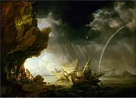 His earlier works show a similarity to the tonal phase of Dutch landscape painting. Later paintings reflect the stronger colours of Italianate classicism.[1] This shift follows the general change in artistic style at the time.[6] Dramatic shipwrecks with dark billowy clouds form a significant part of his oeuvre, as do serene ports and "portraits" of ships.[1][6][8]