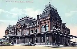 During the railway boom from the 1880s to the early 1910s, railways considered their terminal stations to be "prestige projects". Around the time construction began on the new Bonaventure Station, the competing Canadian Pacific Railway (CPR) started work just two blocks away on Windsor Station, an imposing Richardsonian structure opened in 1889. As the CPR began work on expanding Windsor Station in 1900, the GTR, not to be outdone, seriously considered building a replacement for Bonaventure Station. A design for a new station was commissioned from Chicago architects Charles S. Frost and Albert Hoyt Granger.[3] In the end, however, the new station was never built as the GTR began to focus on its Grand Trunk Pacific transcontinental railway project.