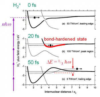 When the existence of bond softening was experimentally verified in 1990,[1] the attention turned to bond hardening. Rather noisy photoelectron spectra reported in the early 1990s implied bond hardening occurring at the 1-photon[2] and 3-photon[3] anticrossings. These reports were received with great interest because bond hardening could explain apparent stabilization of the molecular bond in strong laser fields[4][5] accompanied by a collective ejection of several electrons.[6] However, instead of more convincing evidence, new negative results relegated bond hardening to a remote theoretical possibility.[7][8] Only at the end of the decade, the reality of bond hardening was established in an experiment[9] where the laser pulse duration was varied by chirping.