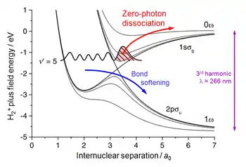 Even more striking challenge to the photon concept comes from the zero-photon dissociation process (ZPD), where nominally no photons are absorbed but some energy is still extracted from the laser field. To demonstrate this process, molecular hydrogen was exposed to 250 fs pulses of the 3rd harmonic of a Ti:Sapphire laser.[12] Since the photon energy was 3 times higher, the spacing of the energy curves shown in Fig. 1 was 3 times larger, replacing the 3-photon crossing with a 1-photon one, as shown in Fig. 4. As before, the laser field changed the crossing to anticrossing, bond softening was induced on its lower branch and bond hardening trapped a part of the vibrational wave packet on the upper branch. In increasing laser intensity the anticrossing gap was getting wider, lifting the wave packet to the 0ω limit and dissociating the molecule with very small KER.