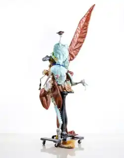 Collura emerged in the later 1990s among artists responding to such issues as the disavowal of referentiality and narrative by modernism, postmodern information overload, and the collapse of various universal distinctions (e.g., organism and machine, human and animal).[7][22][32] Her work has often been described as "hybrid," fitting disparate physical and conceptual elements, processes, references and signifiers into uneasy wholes.[13][33][7] She employs recognizable elements of classic pre-modernist statuary (such as expressive poses and gesture), while challenging that tradition through unconventional construction techniques and fusions of abstract and organic form.[13][5][6] Her method has been described as a "shuffled deck" of images and meanings[33] crossing centuries, aesthetic inspirations (the religious, erotic baroque of Bernini, Disney animation, the grotesque) and cultural sources (mythical, Biblical and religious stories, classic Hollywood movies).[2][9][1][34]