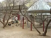 By 1997, the zoo included bobcats, burros, coatimundi and lynx, coyotes, ferrets, hedgehogs, llamas, porcupines, prairie dogs, squirrels, turtles, and a woodchuck.[13] Emus would also be added to the zoo, including one that had been abandoned in the desert.[17] Peacocks and deer freely roamed the fenced zoo area. The ranch also featured a large stable of horses.[6][110] Levinson raised several of the animals.[21] Most of the zoo was occupied by rescued animals who had been mistreated.[43] The petting zoo included goats, deer, sheep, and buffalo.[111][2] Some of the animals could naturally withstand the local heat, while others had covered enclosures with misters and bodies of water. To stay cool, the animals were also regularly given ice packs.[112]