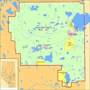 Bonnyville-Cold Lake is primarily rural electoral district is found in northeastern Alberta along the Saskatchewan border. The riding was coterminous with the Municipal District of Bonnyville No. 87, and also contains the following municipalities: