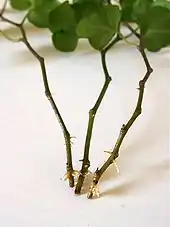 Cuttings. In taking a cutting, part of a growing plant is cut off and placed in a growing medium to develop roots. If the part that is cut off is fairly thick, like a mature branch, it can be grown into an aged-looking bonsai more quickly than can a seed. Thinner and younger cuttings tend to strike roots more easily than thicker or more mature ones. In bonsai propagation, cuttings usually provide source material to be grown for some time before training.[3]
